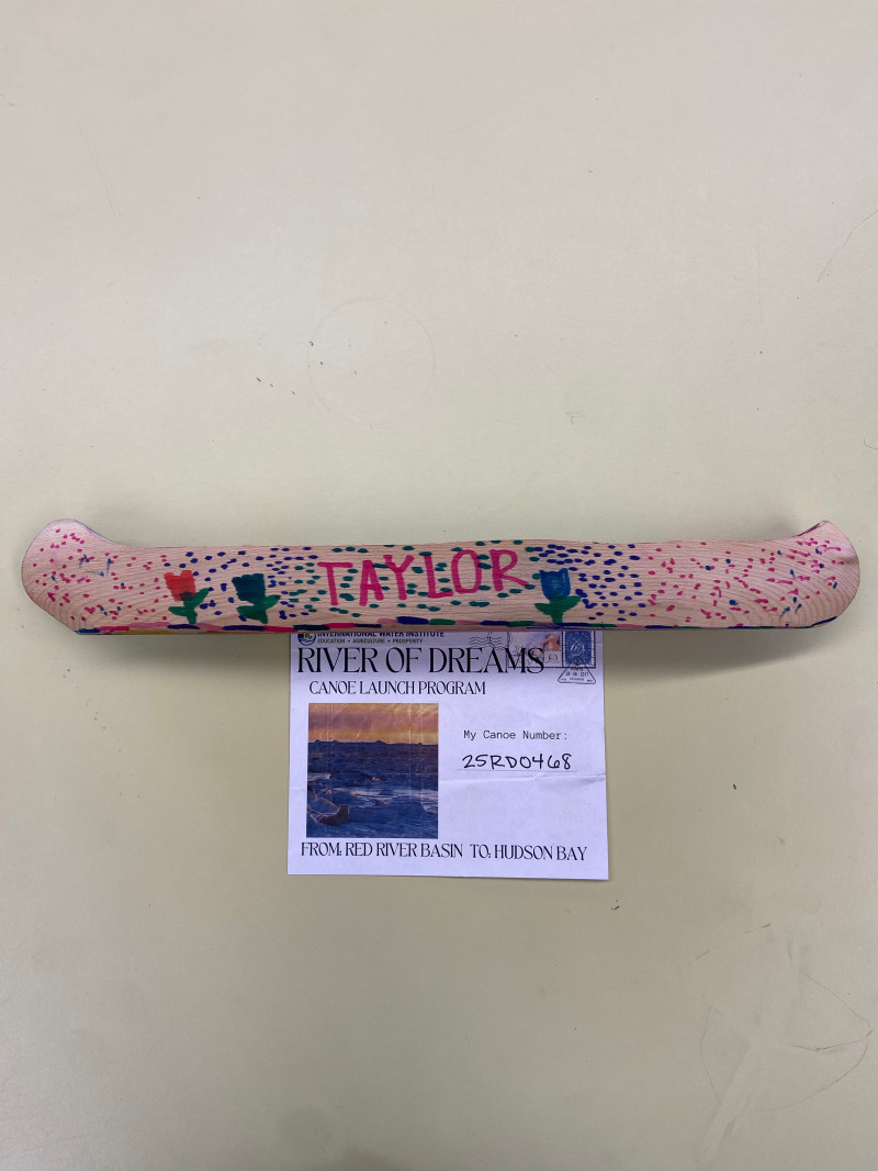 I named my canoe Taylor because Taylor Swift is my favorite singer. Taylor's journey begins in the Middle River in Argyle MN. I hope it sees ducks fish trees grass and a lot of other animals. I want it to end up in the Hudson Bay because it leads to the ocean. From where we are launching our canoes it is 8 hours and 41 minutes by land to the Hudson Bay and it is 512.4 miles from Argyle. I hope if someone finds it they will return on its journey.