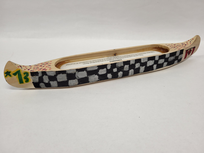 At firstPaddle sits on top of the sticky wet hard ice block and waits as the ice melts. Drip sloshdripslosh. Birds are chirping ice melting and the sun rising high. Then the day came the ice melted and Paddle was on his way to Hudson Bay. Seeing bright green slimy weeds and frog eggs on floating algae. Paddle was so happy that he was finally floating down the river. Then a little boy named Leopard found Paddle when he was playing at the river. He cared about the boat so much and he wanted to keep it for life but we knew the rules. If you find this please bring it into the river and let him continue his journey.