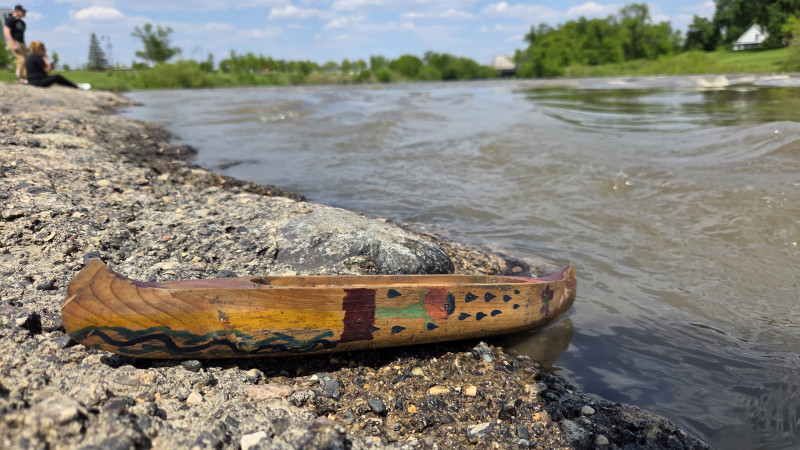 I found the canoe (along with 3 others) near Dike East Park along the Red River in Fargo, ND. It was in a pile of mud and sticks from the recent flooding, but I cleaned it up and sent it back down river (northbound).