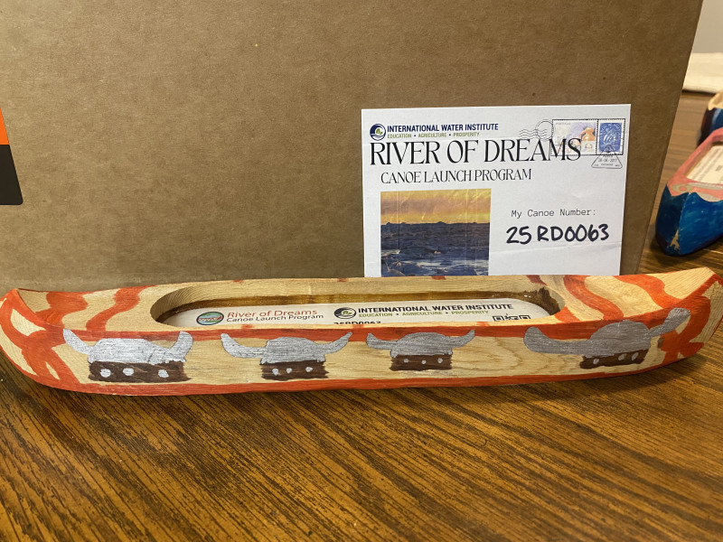 I put my canoe in the water and it flipped upside down but got right back up. A bird sat on it then a small bass jumped over the bird and scared it away. He saw carp walleye pike catfish and goldeye also pheasant turkey deer rabbits fox and coyote. Then he saw a flying squirrel. Then he got in the Sheyenne river and saw a sturgeon. It took his boat down then a gigantic bass bit him and floated up to the Hudson Bay. He saw polar bears moose salmon and caribou. For the design of my canoe I picked orange for adventure vikings for strength and owls for intelligence.