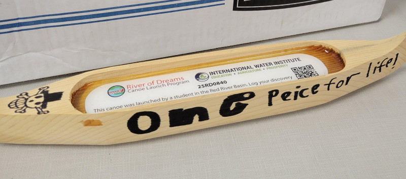 After being launched into the Sheyenne river the canoe gets stuck in a fallen tree. A month later a beaver frees it. Then it continues down river but when the water freezes it gets stuck all winter. After a while it gets picked up by someone on vacation and gets taken 80 miles north and continues to the Hudson bay where it gets to the ocean but is picked up by a freighter and stays in Hudson bay where he ends his journey.